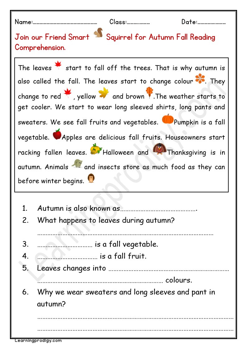 Free Printable Autumn Fall English Reading Comprehension For Grade 4
