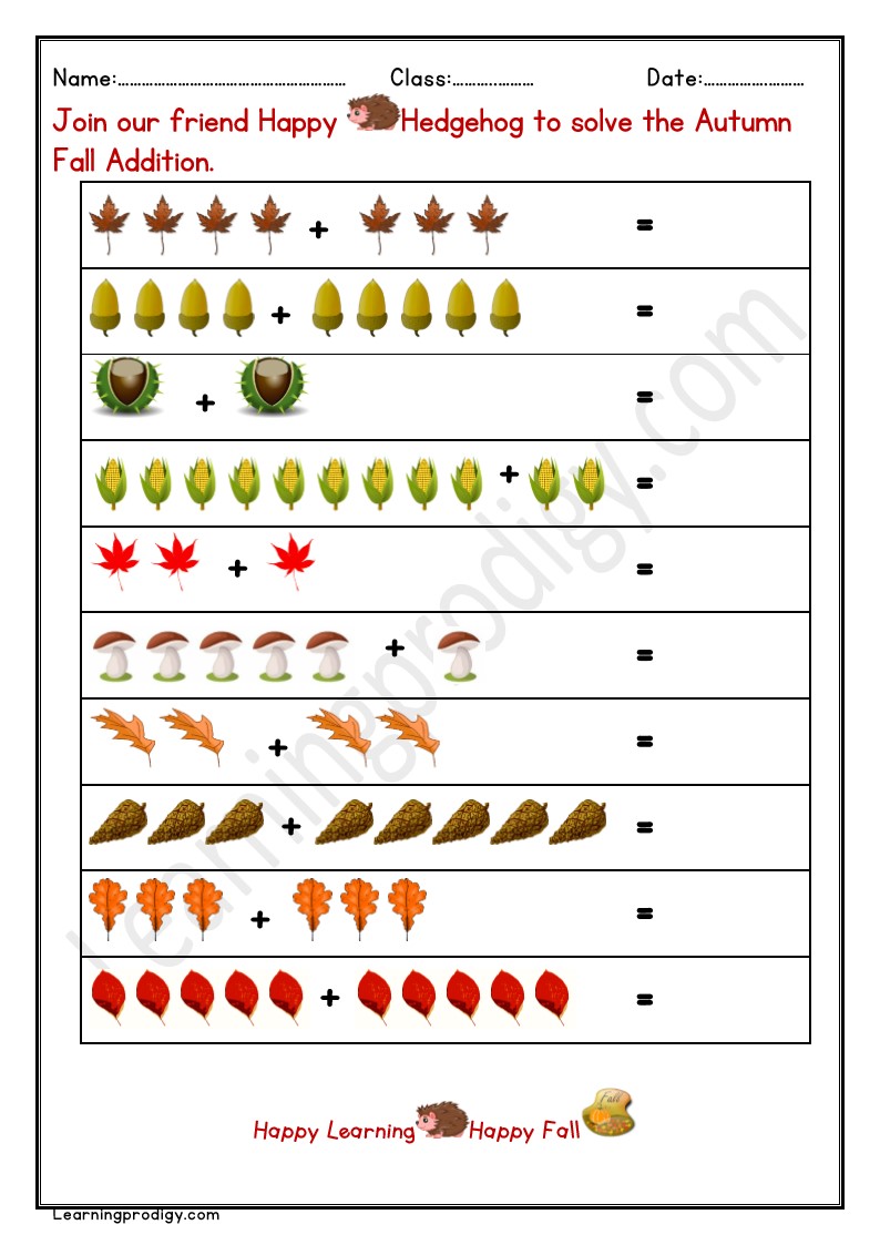 Free Printable Fall Addition Worksheet with Pictures for Kindergarten Kids with Pictures