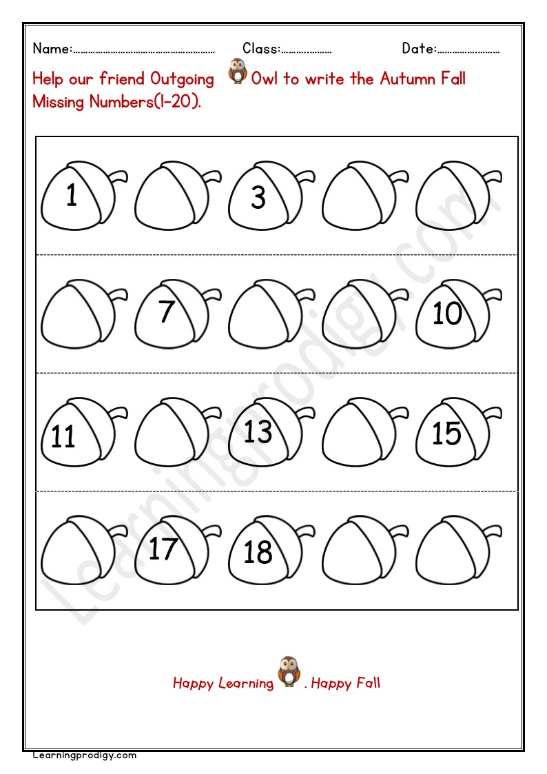 Free PDF Autumn Fall Missing Numbers Worksheet for Kindergarten Kids with Pictures